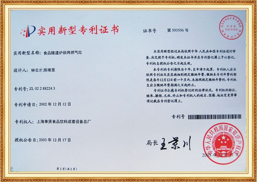 شهادة براءة اختراع فرن نفق الغاز لمعالجة البسكويت