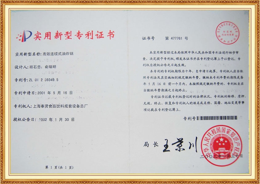 شهادة براءة اختراع لقلي الزيت المستمر عالي الكفاءة