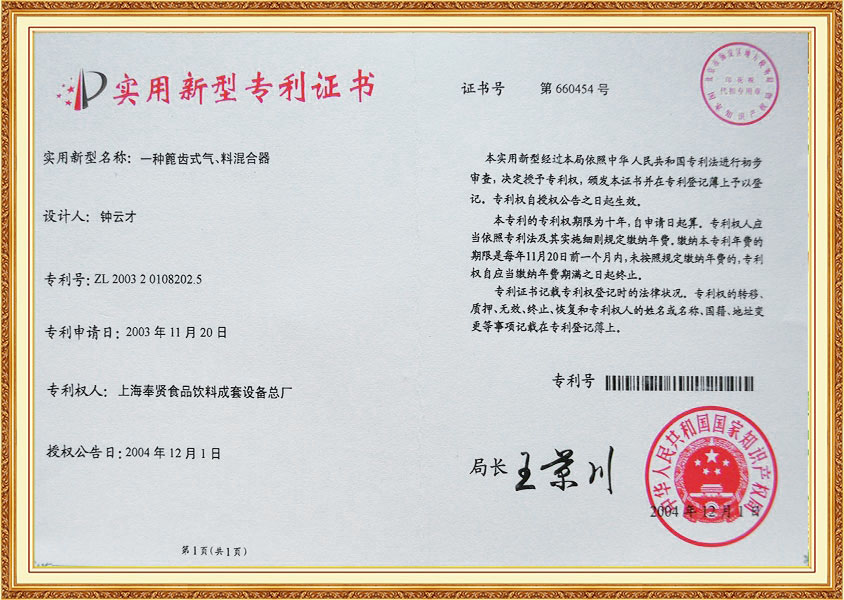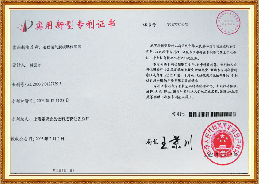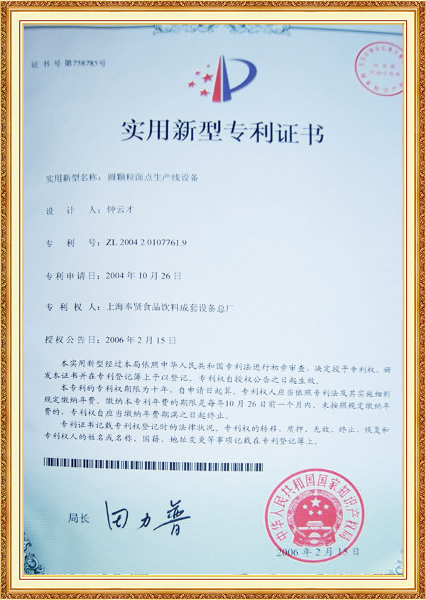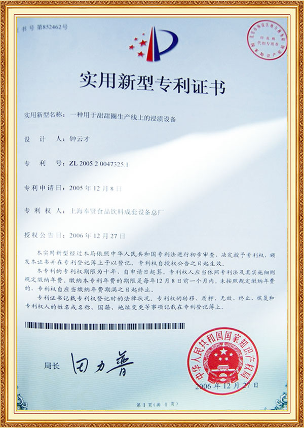 شهادة براءة اختراع لآلة النقع لخط إنتاج الدونات
