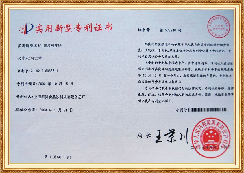 شهادة براءة اختراع لفرن قلي رقائق البطاطس بالزيت