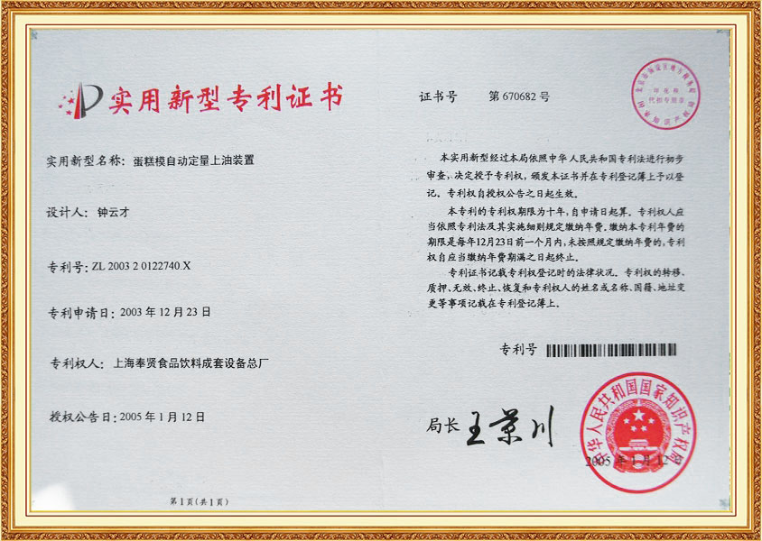 شهادة براءة اختراع نظام تغذية الزيت الكمي في خط إنتاج الكيك