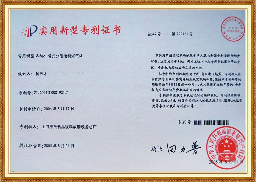 شهادة براءة اختراع لموقد الخبز في فرن نفق الطعام