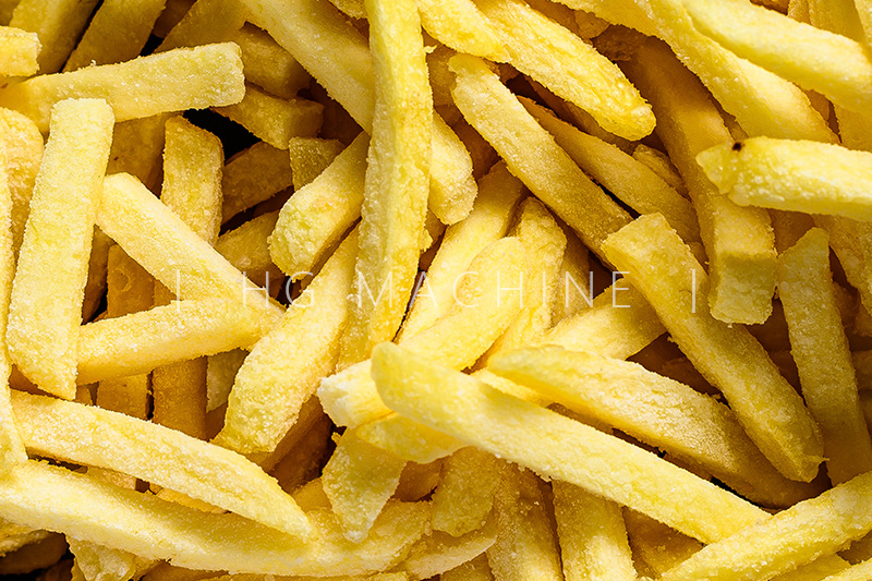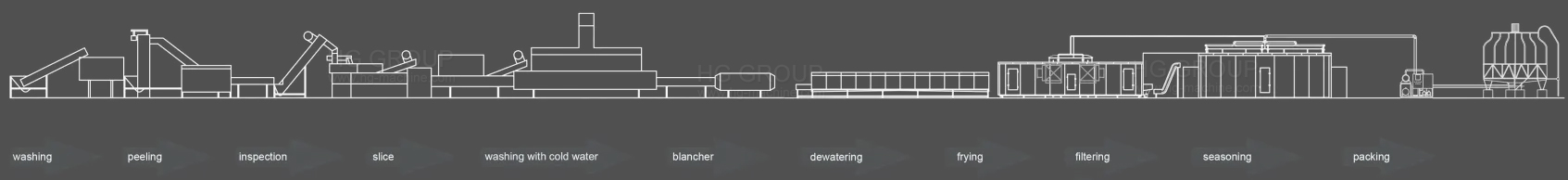 المكونات الرئيسية للخط: ناقل رفع، آلة إزالة الحصى، آلة الغسيل، قادوس الوزن، مقشرة بالبخار، قادوس التجميع والتغذية، فاصل بالفرشاة، ناقل الفحص، آلة التقطيع، آلة السلق الأولي، آلة السلق الثانوي، مرشح المياه بالاهتزاز، آلة التجفيف الأولي، مقلاة القلي بالزيت، خزان الزيت، آلة إزالة الزيت الزائد (نوع اهتزازي)، مبرد أولي، ووحدة التجميد السريع